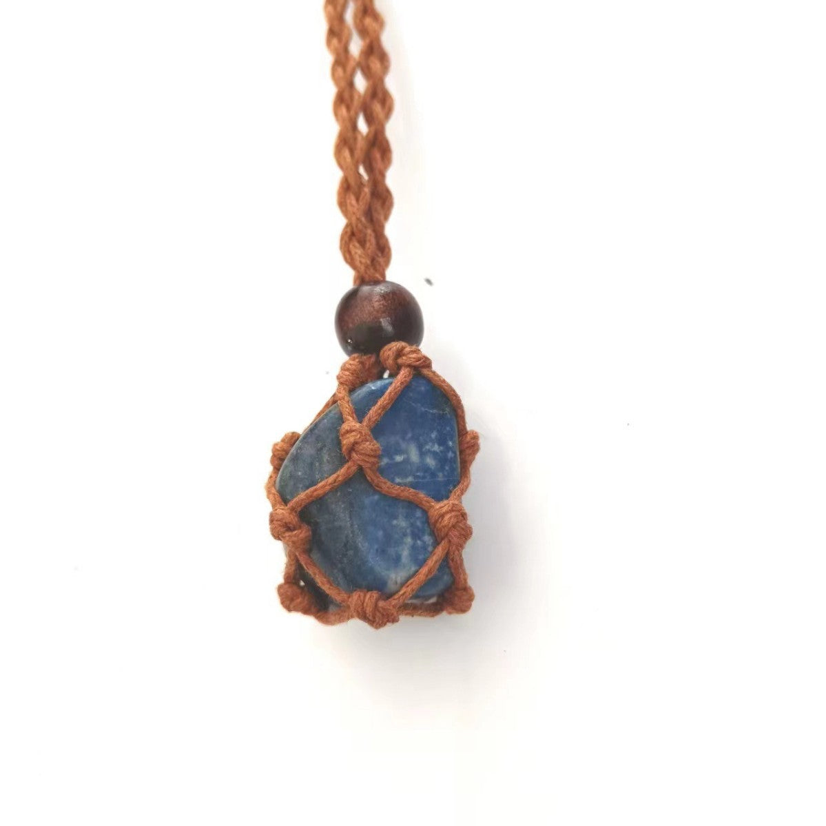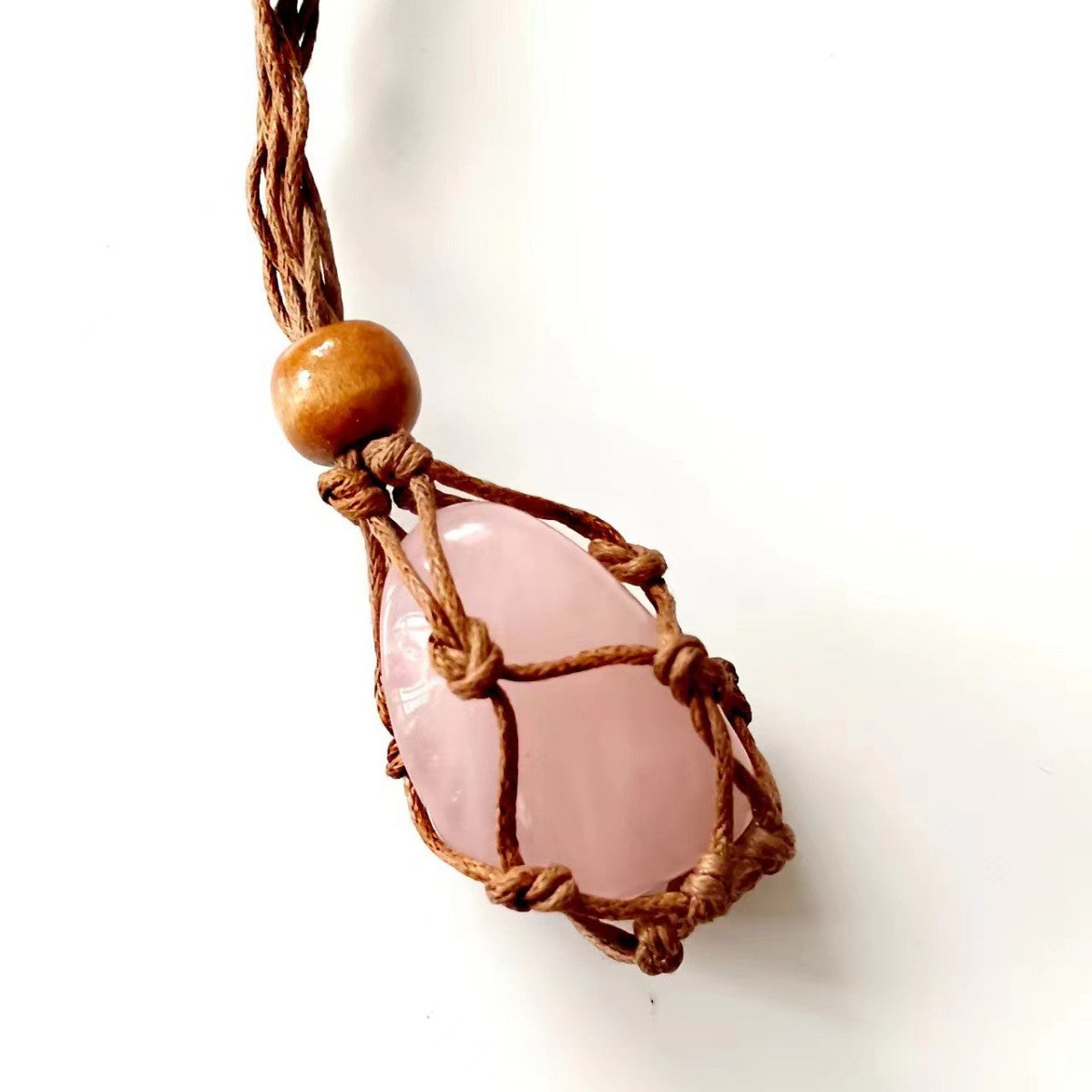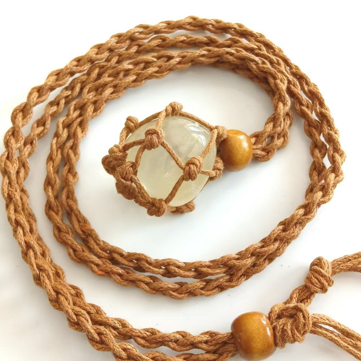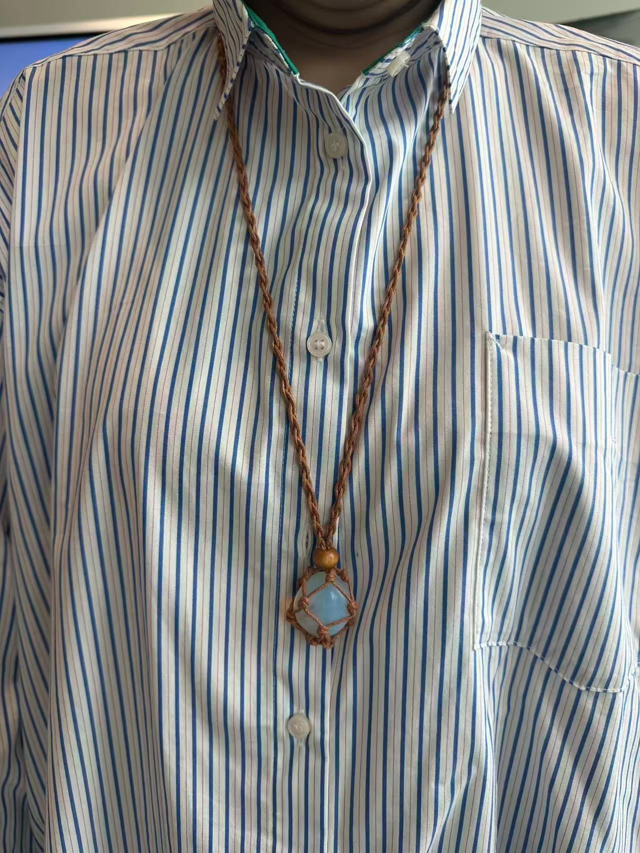 ハンドメイドで編み上げたマクラメコードに、天然石を包み込んだペンダント。