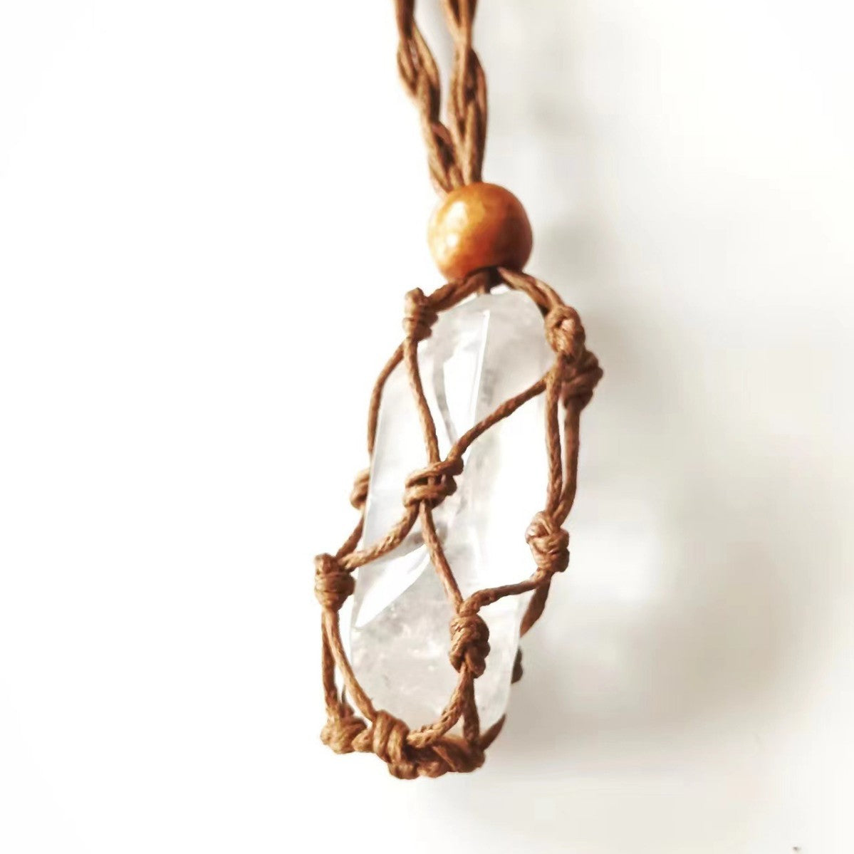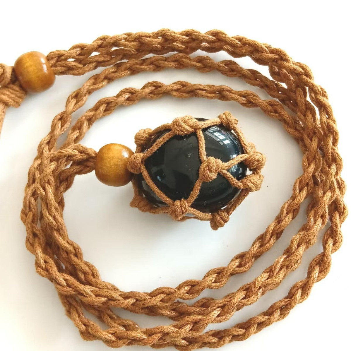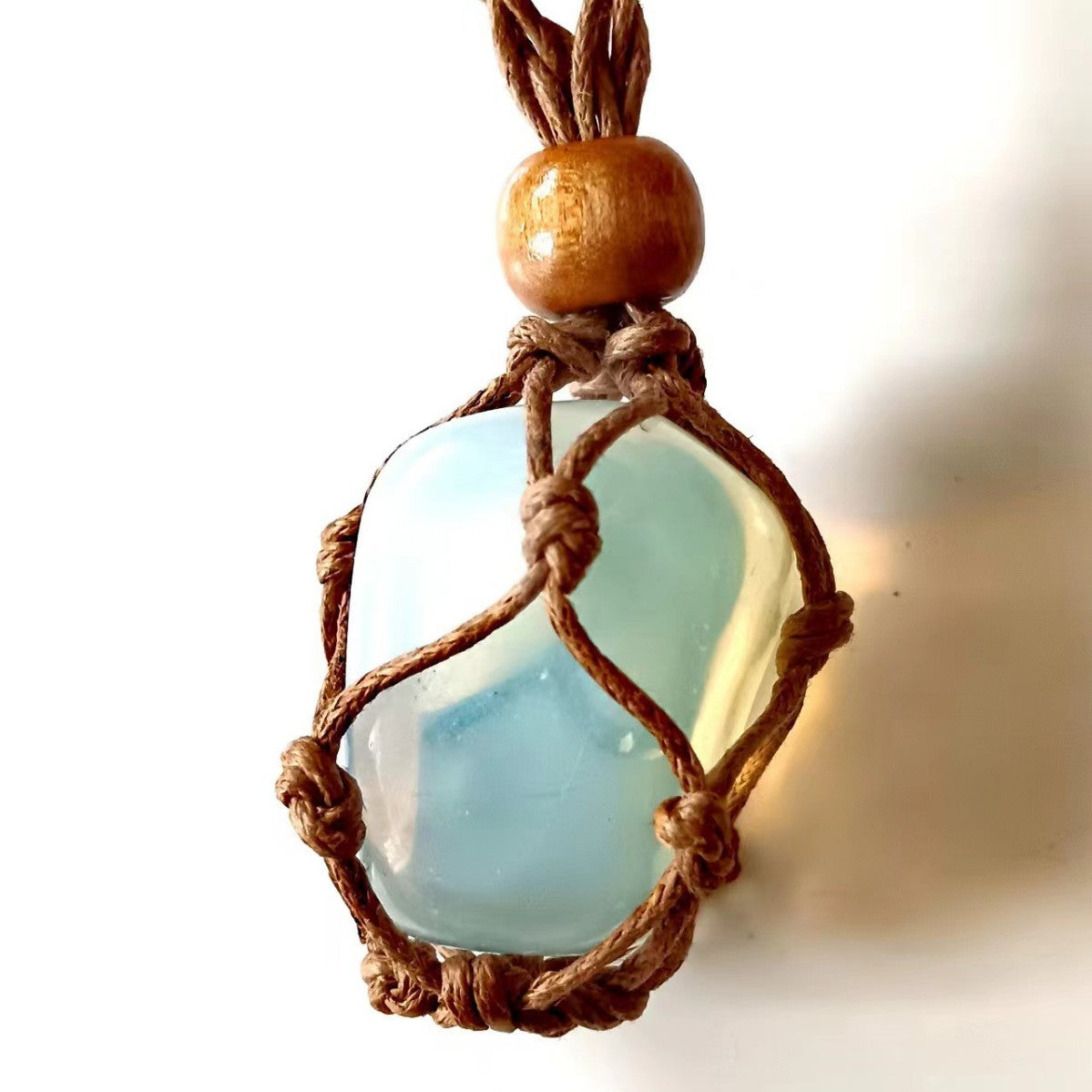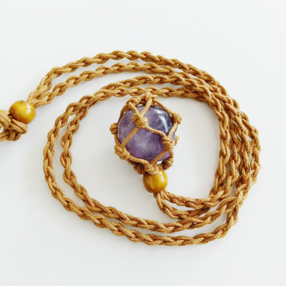 ハンドメイドで編み上げたマクラメコードに、天然石を包み込んだペンダント。